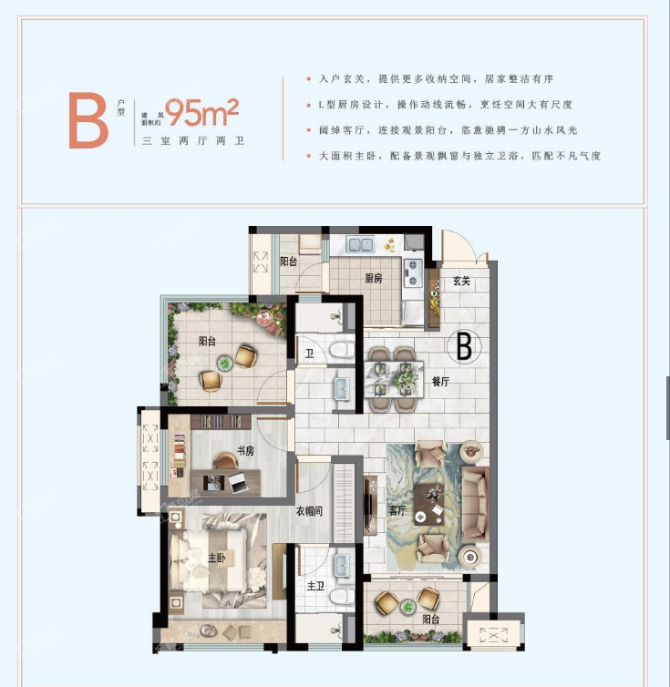 三房两厅两卫95方户型 (95㎡建面)