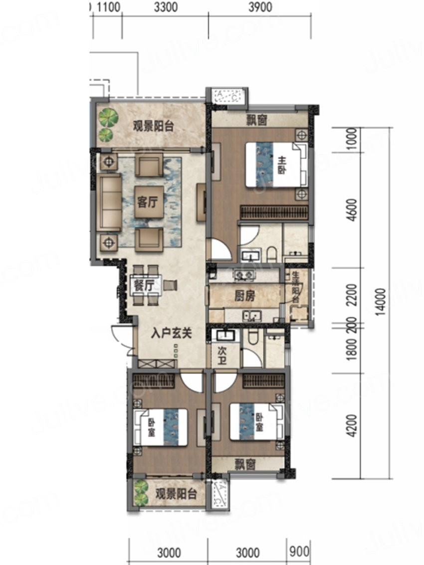 3室2厅1厨2卫逸景湾一期A区A户型 (110㎡建面)